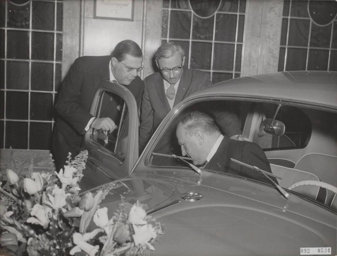 Two VWs were handed over to the Anne Frank Foundation in Krasnapolski, Amsterdam, on February 6, 1959. They were received on behalf of the foundation by Ton Kon and M. A. de Roos on the board of directors. From left to right: Ben Pon the car importer, Ton Kon and M. A. Roos in the car